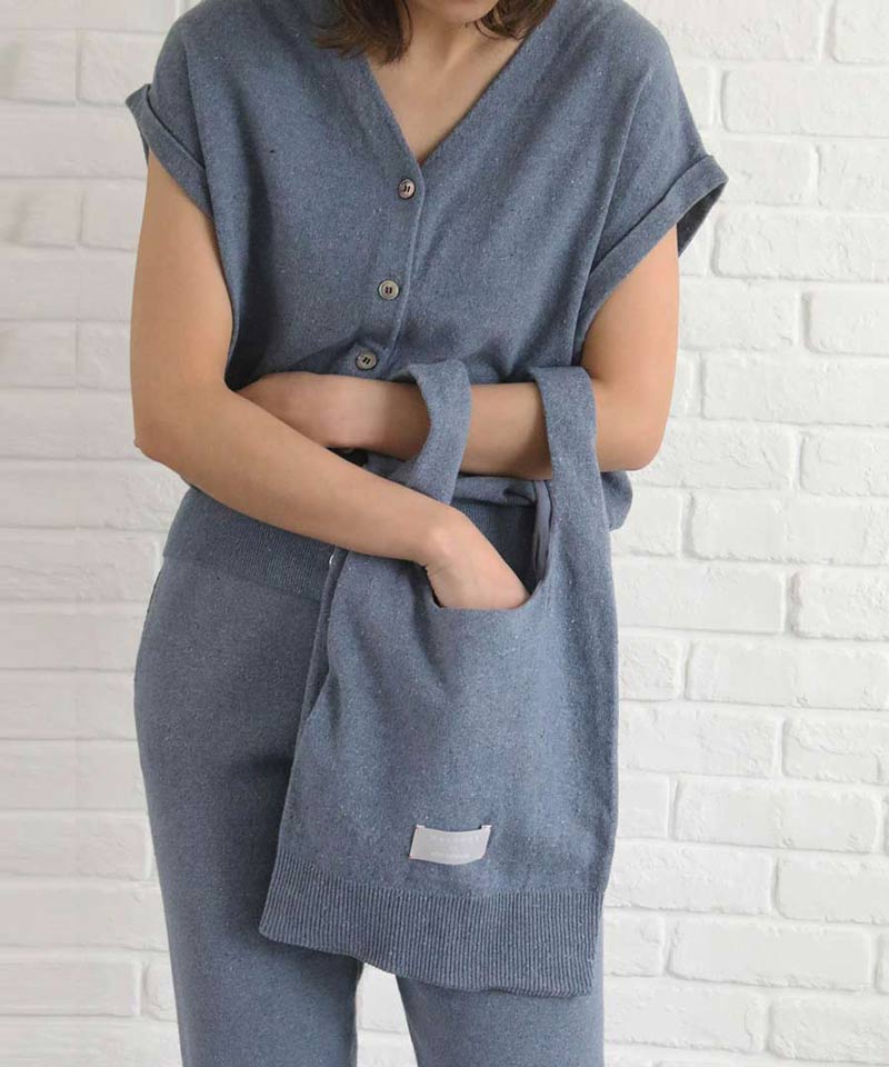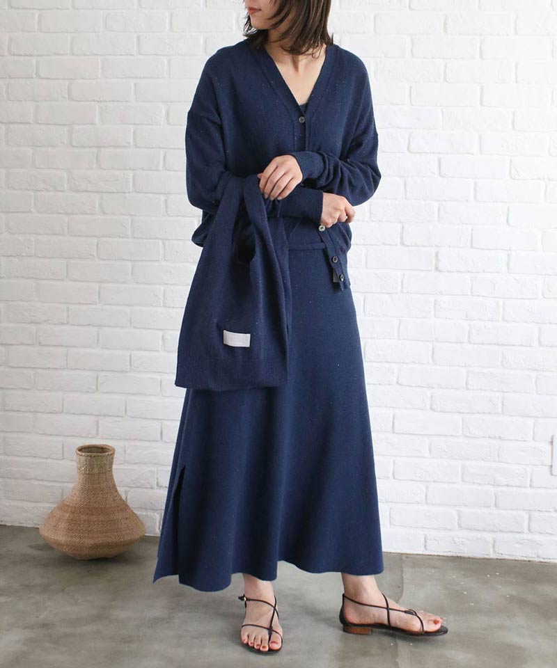 程よくフィットするシルエットのニットキャミソール、リラックスしつつもシックに着られるジョガーパンツ、シンプルなVネックカーディガン、Aラインシルエットのニットスカート、シリーズのなかで全てセットアップできるインディゴカラーのアイテムたちが一堂に並びます。